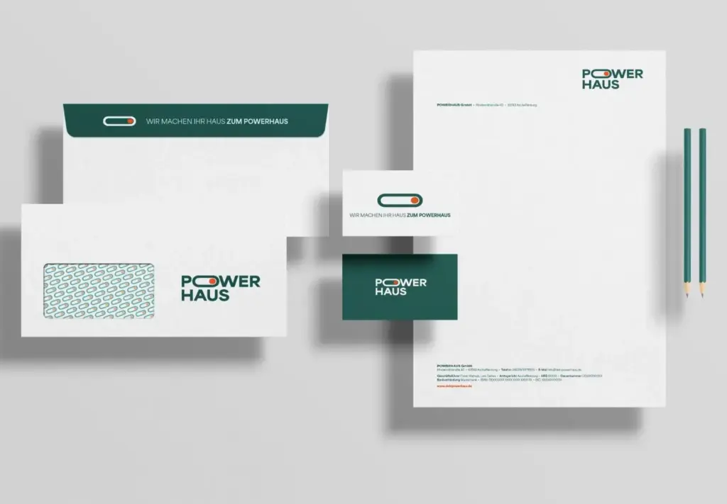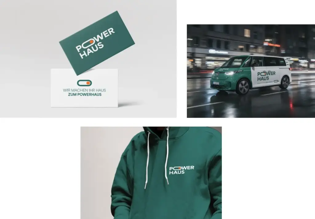 Powerhaus entfaltet sich auf vielen Kanälen: Visitenkarten und Geschäftsausstattung, Fahrzeugbeschriftungen, Arbeitskleidung und Merch für das richtige Teamgefühl.